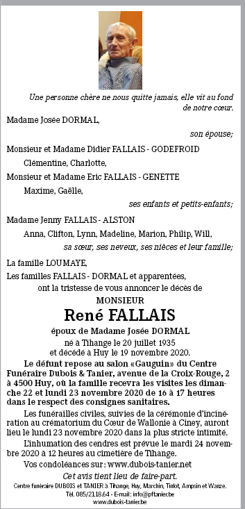 Décédé à Huy (4500) le jeudi 19 novembre 2020 à l'âge de 85 ans