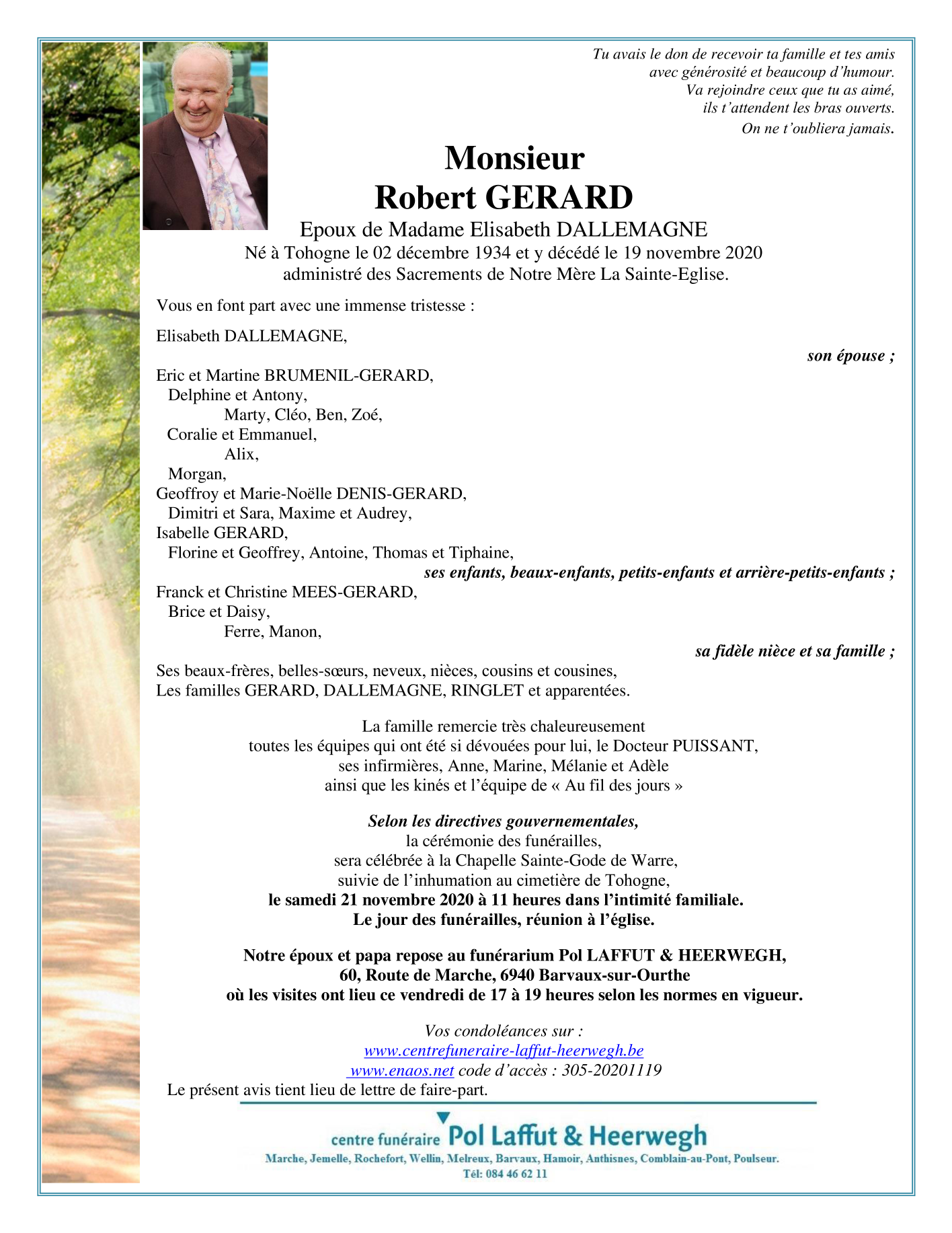Décédé à Warre (6941) le jeudi 19 novembre 2020 à l'âge de 85 ans
