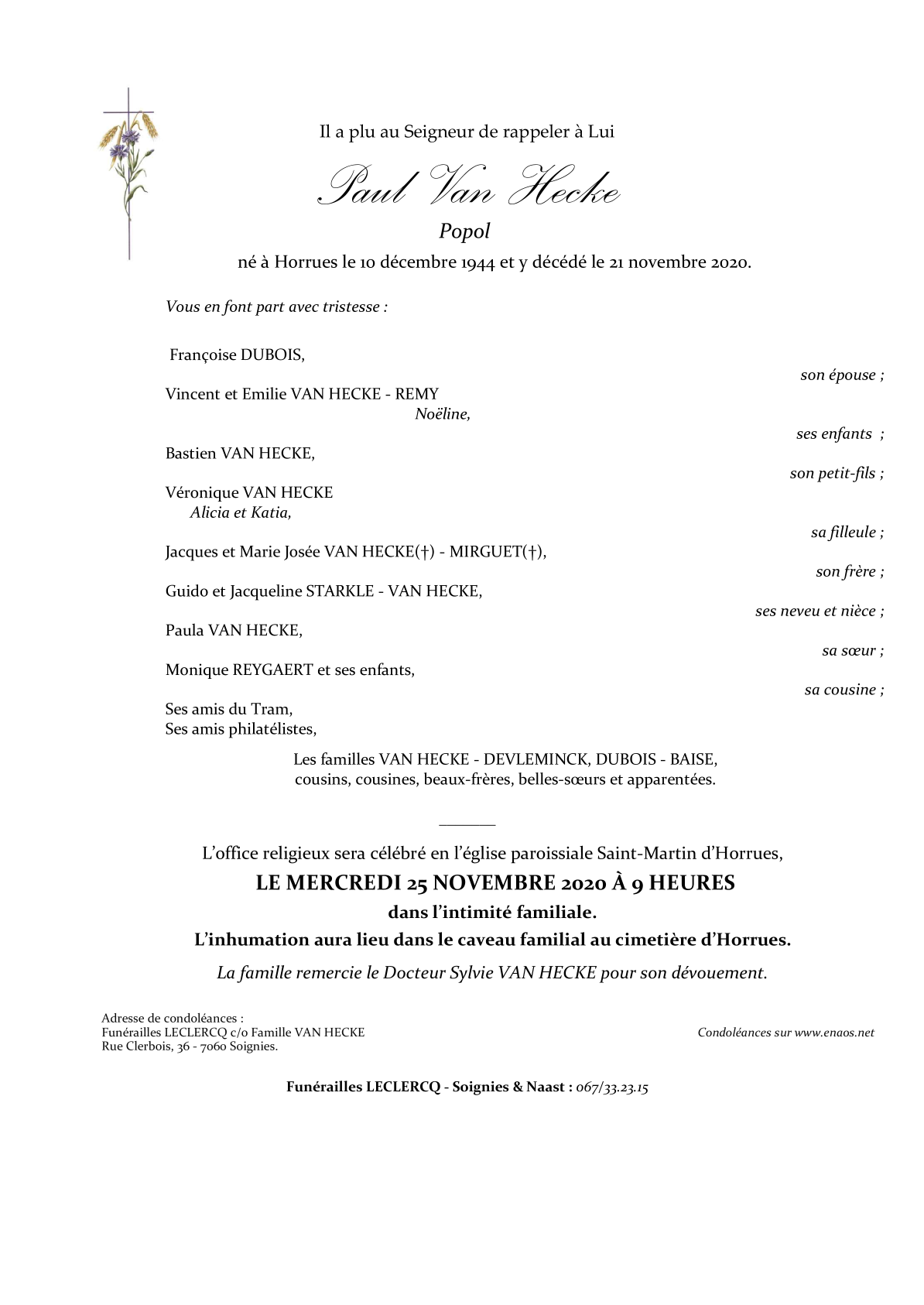 Overleden te Horrues (7060) op zaterdag 21 november 2020 op 75-jarige leeftijd