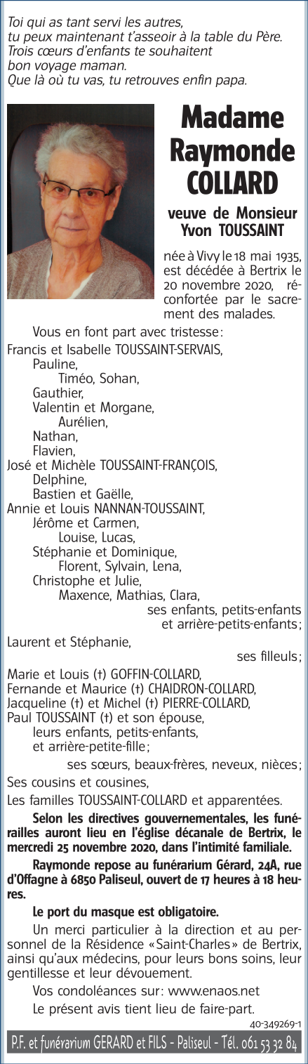Décédée à Bertrix (6880) le vendredi 20 novembre 2020 à l'âge de 85 ans