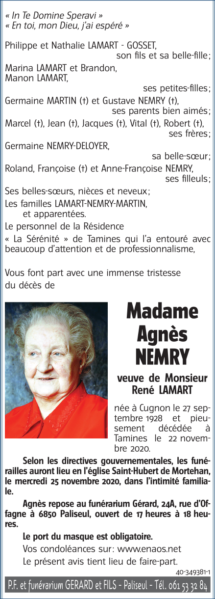 Décédée à Tamines (5060) le dimanche 22 novembre 2020 à l'âge de 92 ans