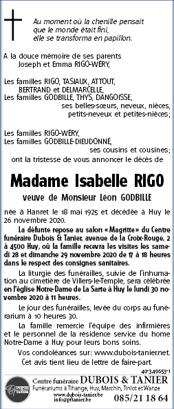 Décédée à Huy (4500) le jeudi 26 novembre 2020 à l'âge de 95 ans