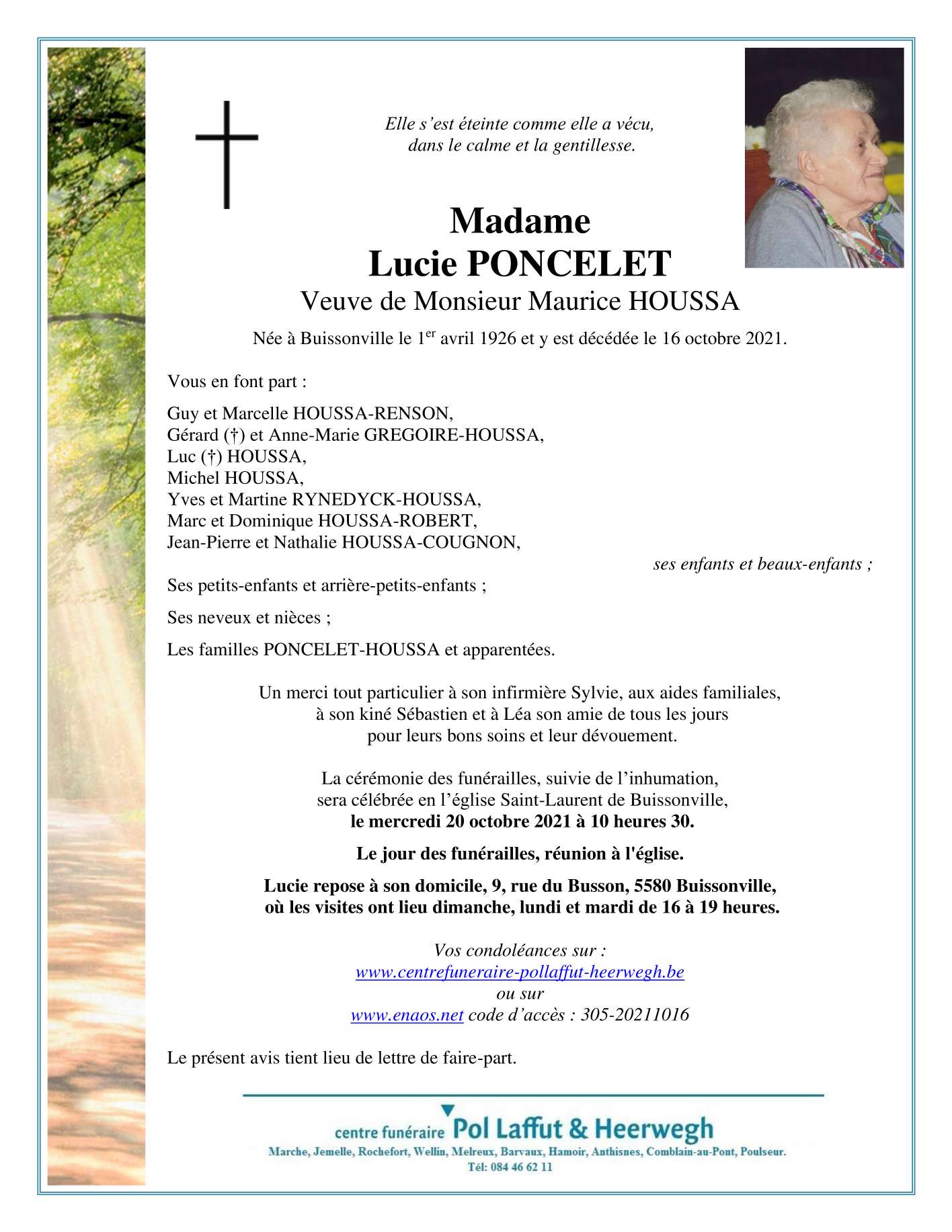Décédée à Buissonville (5580) le samedi 16 octobre 2021 à l'âge de 95 ans