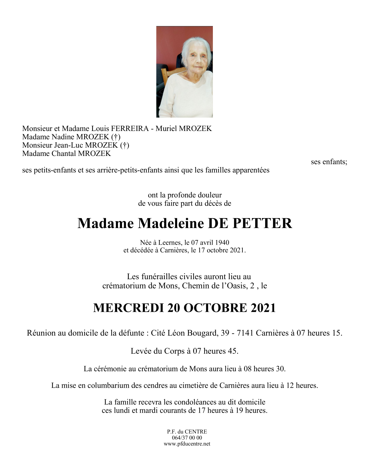 Décédée à Carnières (7141) le dimanche 17 octobre 2021 à l'âge de 81 ans