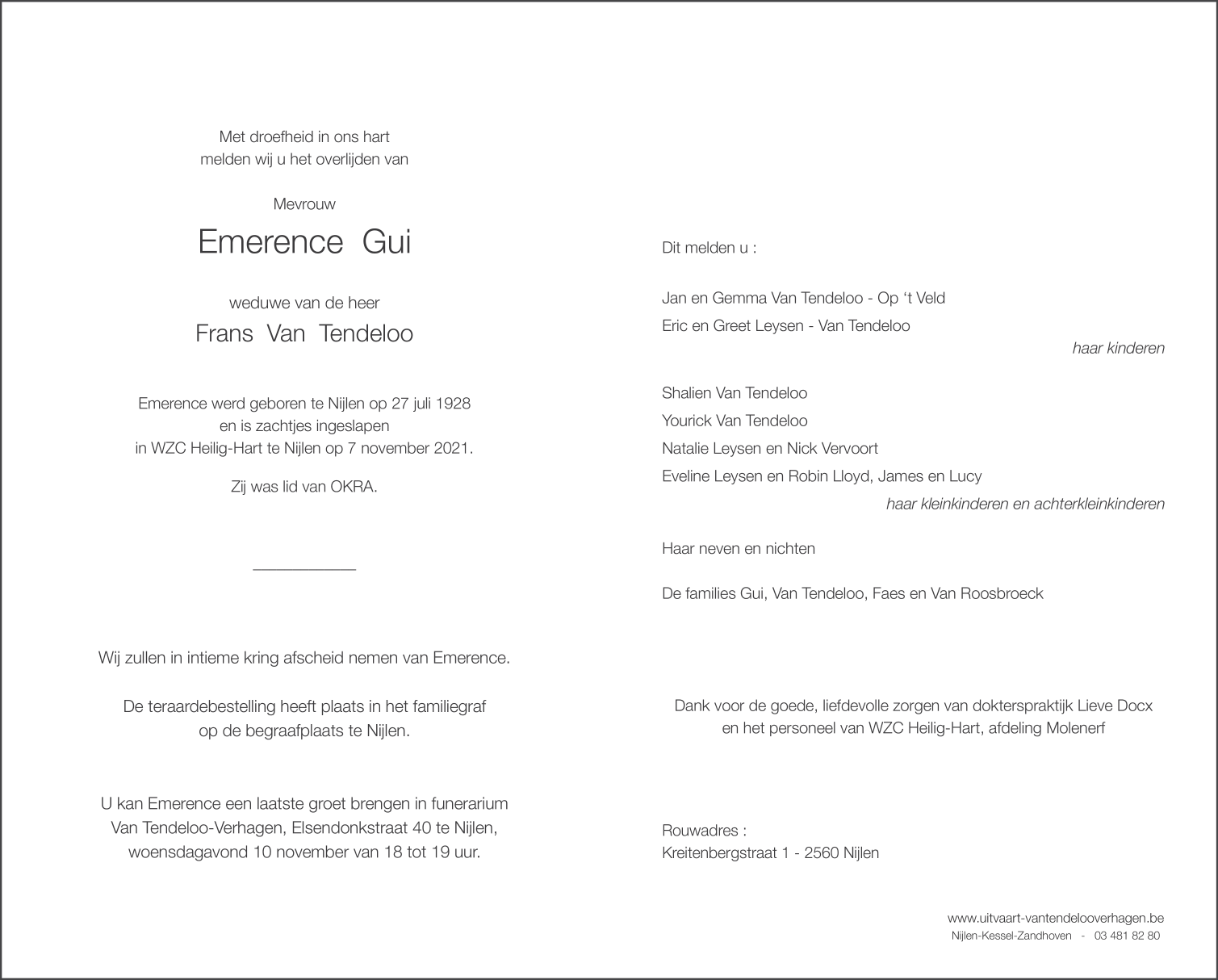 Décédée à Nijlen (2560) le dimanche 7 novembre 2021 à l'âge de 93 ans