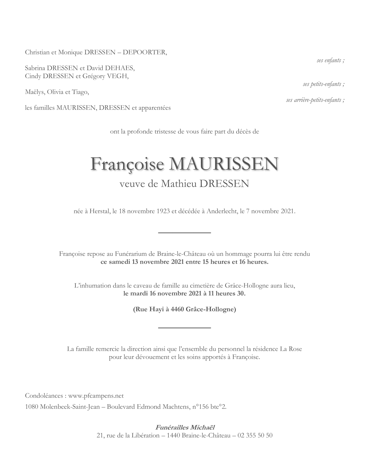 Décédée à Anderlecht (1070) le dimanche 7 novembre 2021 à l'âge de 97 ans