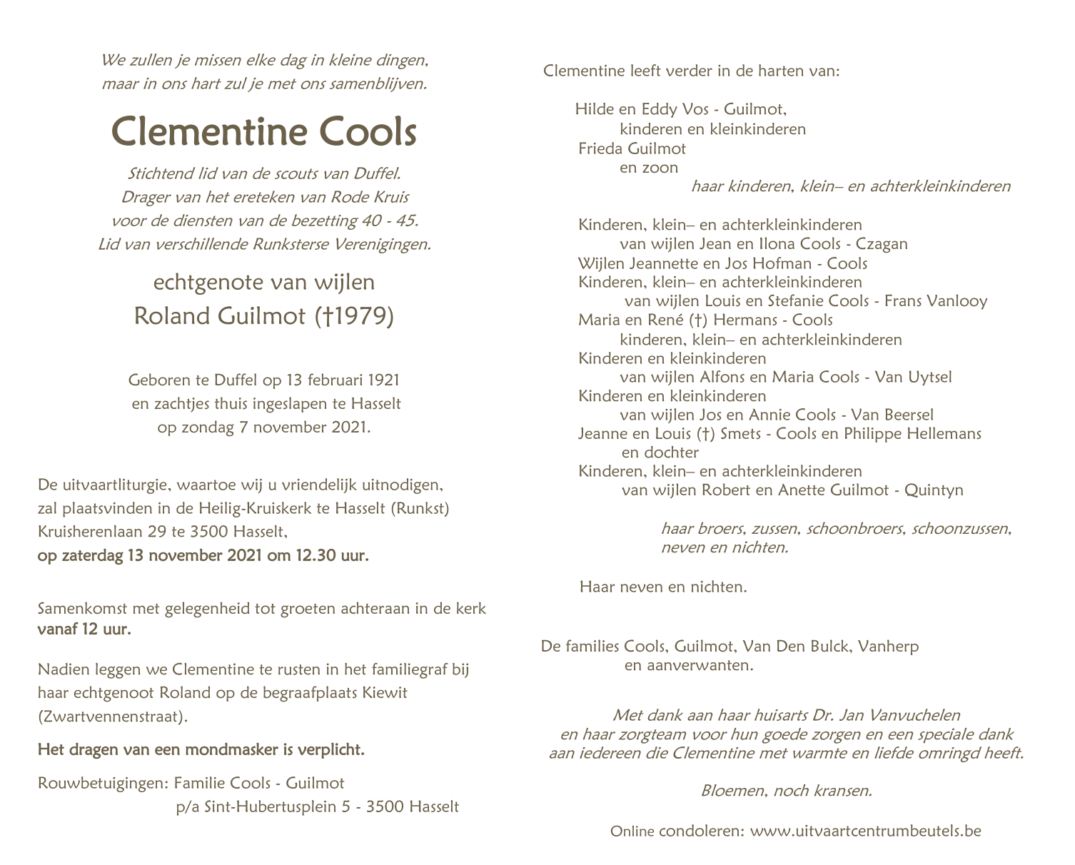 Décédée à Hasselt (3500) le dimanche 7 novembre 2021 à l'âge de 100 ans