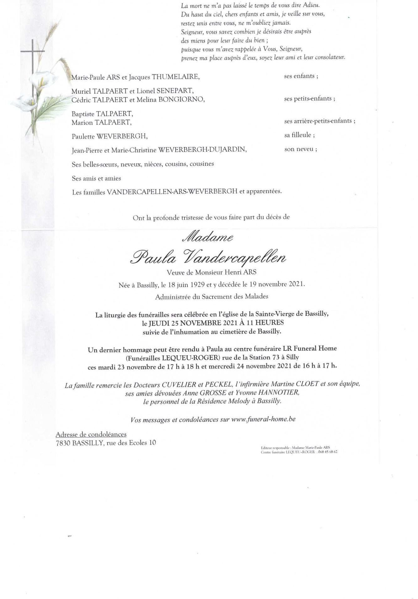 Fallecida en Bassilly (7830) el viernes, 19 de noviembre de 2021 a la edad de 92 años