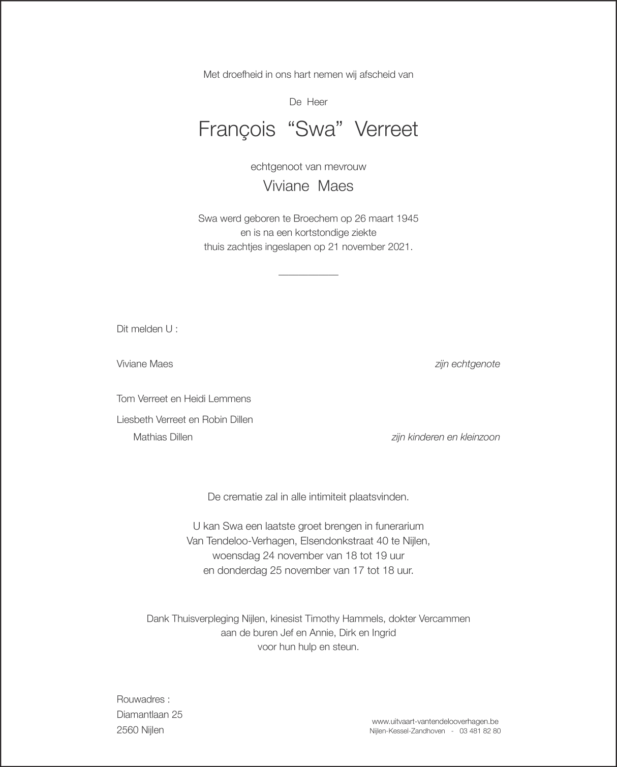 Décédé à Nijlen (2560) le dimanche 21 novembre 2021 à l'âge de 76 ans