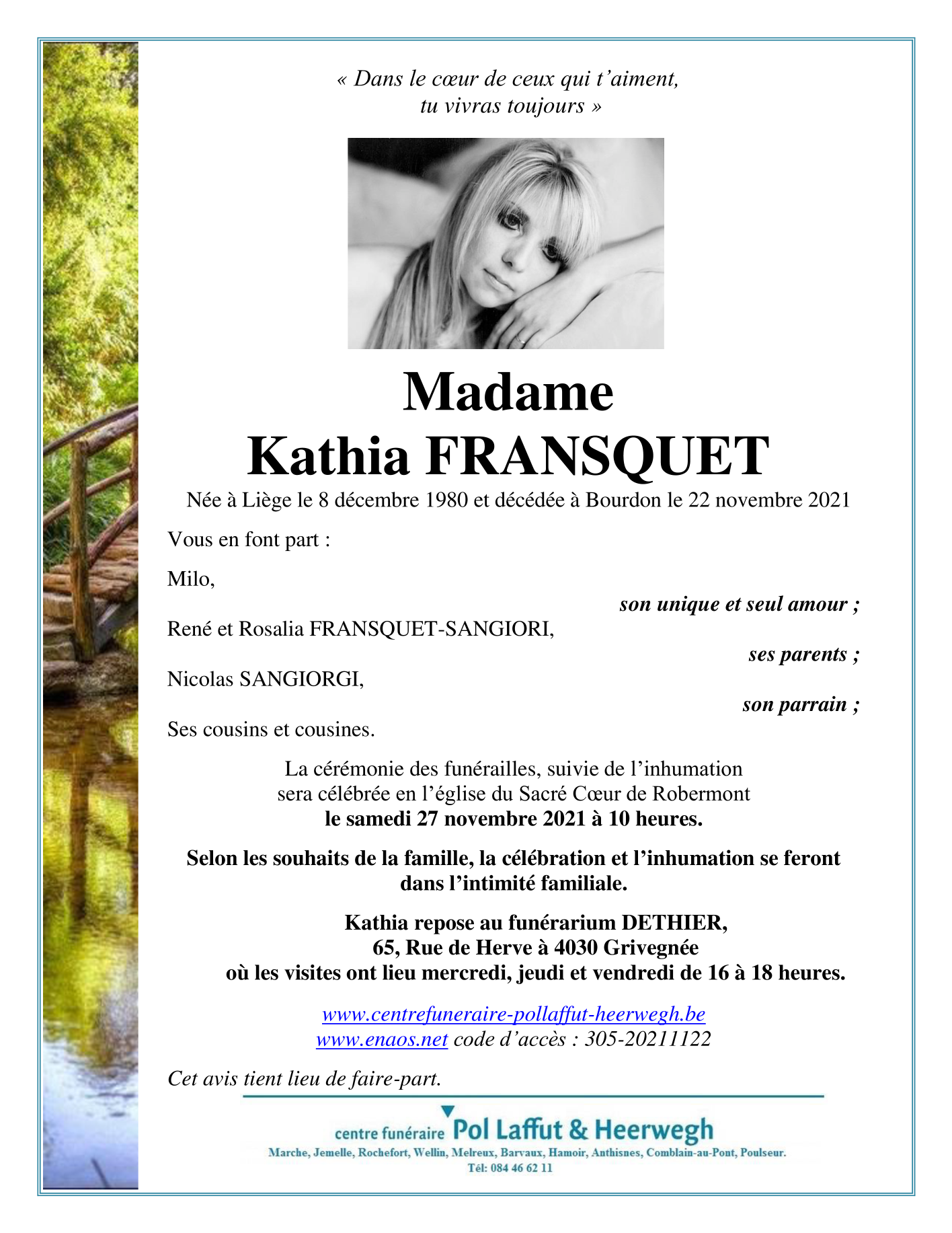 Décédée à Bourdon (6990) le lundi 22 novembre 2021 à l'âge de 40 ans