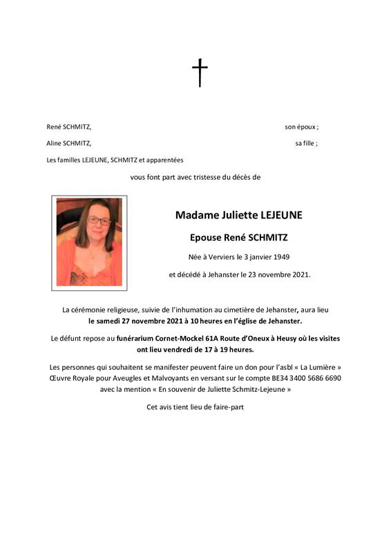 Décédée à Jehanster (4910) le mardi 23 novembre 2021 à l'âge de 72 ans