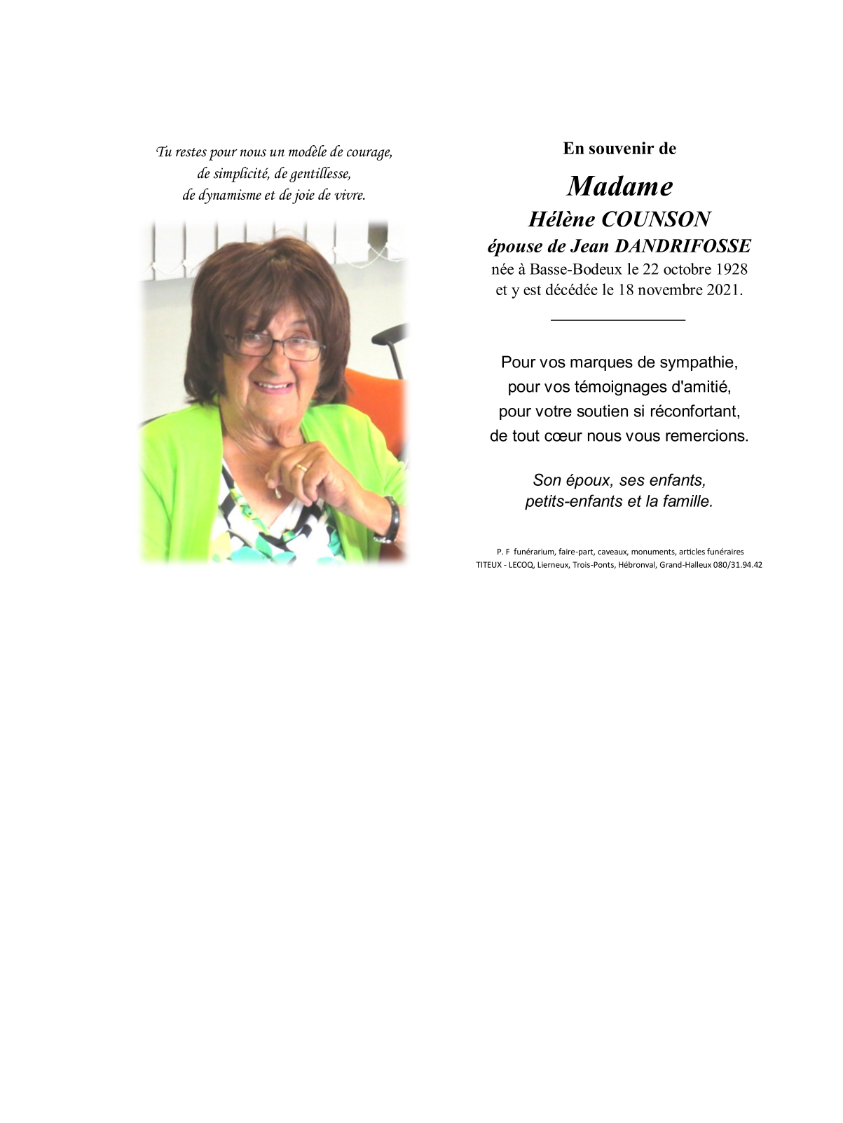 Décédée à Basse-Bodeux (4983) le jeudi 18 novembre 2021 à l'âge de 93 ans