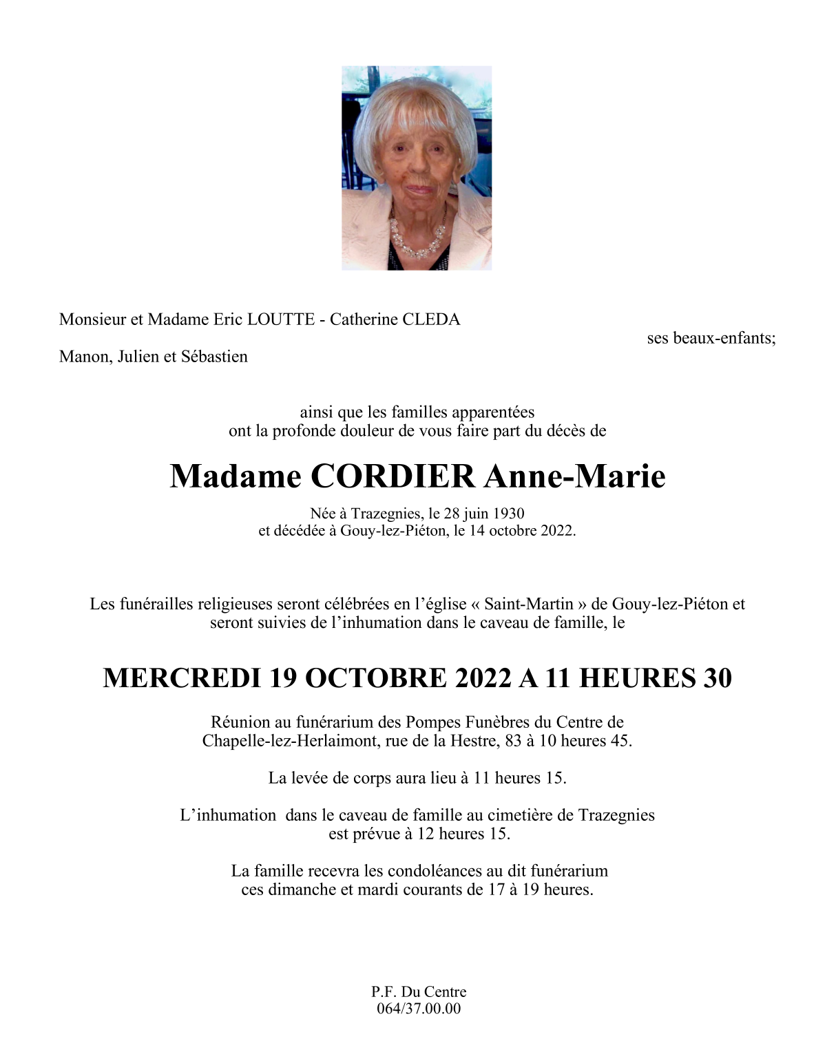 Décédée à Gouy-lez-Piéton (6181) le vendredi 14 octobre 2022 à l'âge de 92 ans