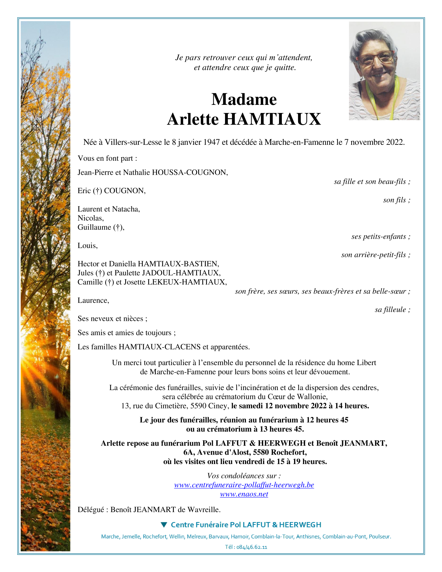 Décédée à Marche-en-Famenne (6900) le lundi 7 novembre 2022 à l'âge de 75 ans