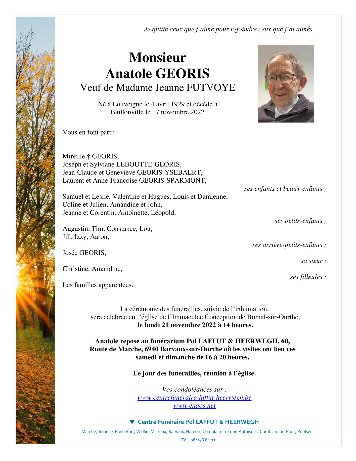 Décédé à Baillonville (5377) le jeudi 17 novembre 2022 à l'âge de 93 ans