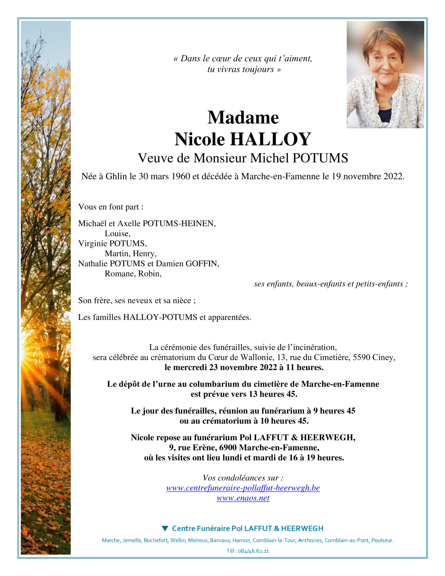 Décédée à Marche-en-Famenne (6900) le samedi 19 novembre 2022 à l'âge de 62 ans