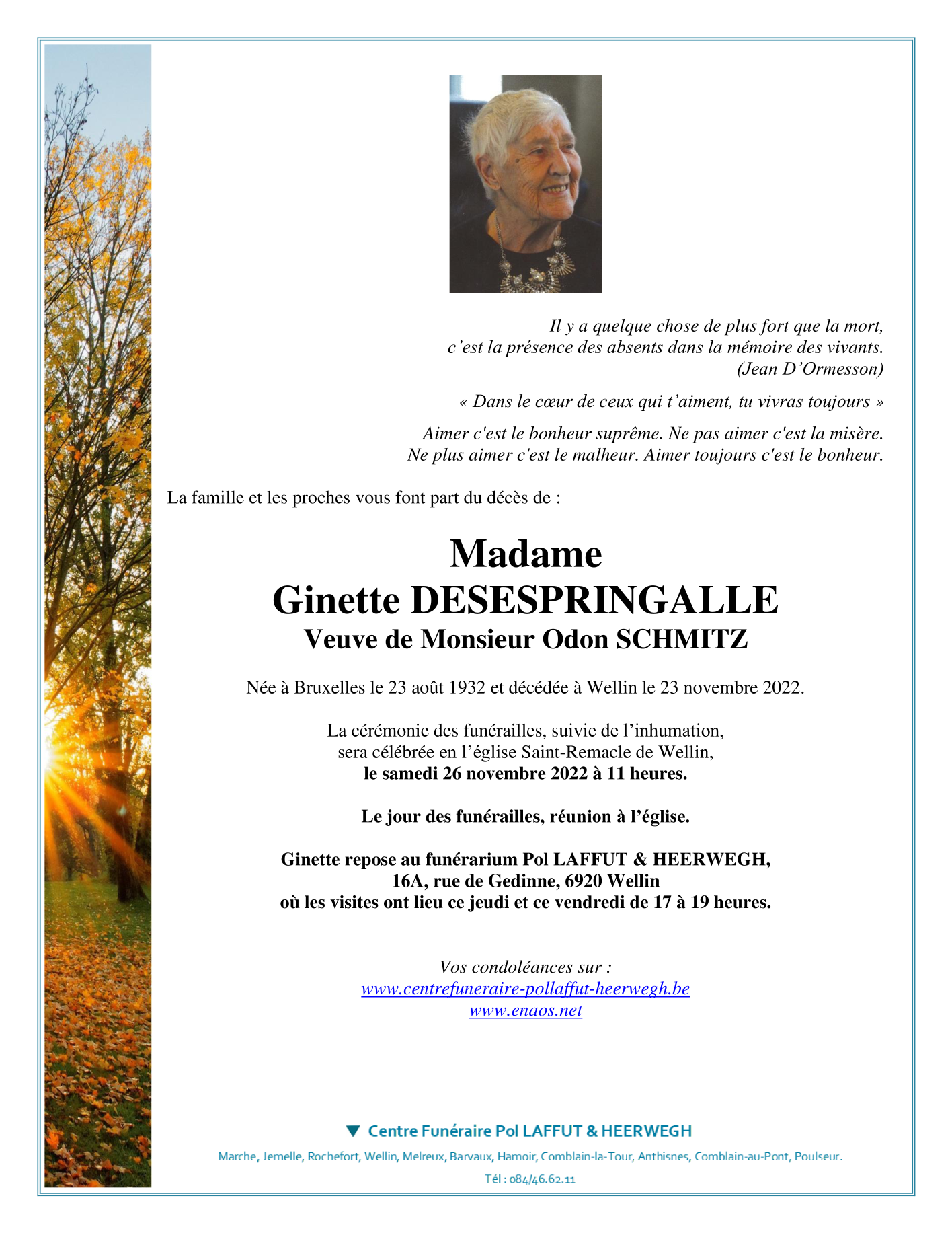 Décédée à Wellin (6920) le mercredi 23 novembre 2022 à l'âge de 90 ans