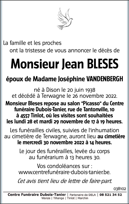 Décédé à Terwagne (4560) le samedi 26 novembre 2022 à l'âge de 84 ans