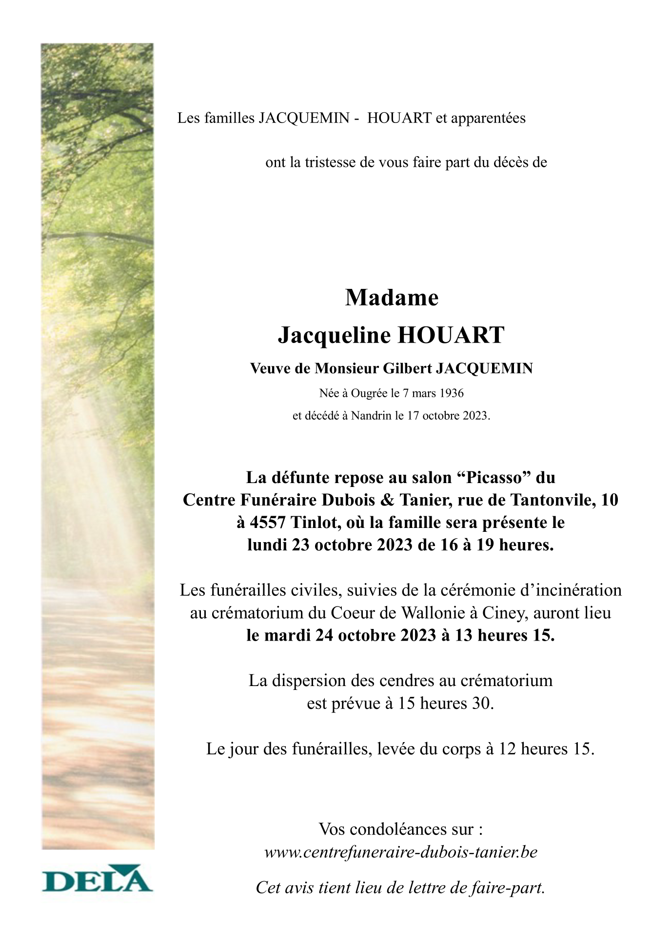 Décédée à Nandrin (4550) le mardi 17 octobre 2023 à l'âge de 87 ans