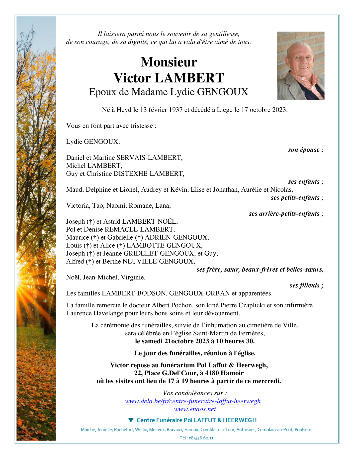 Décédé à Liège (4000) le mardi 17 octobre 2023 à l'âge de 86 ans