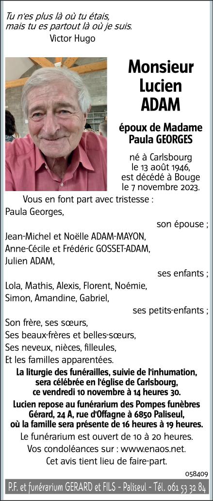 Décédé à Bouge (5004) le mardi 7 novembre 2023 à l'âge de 77 ans
