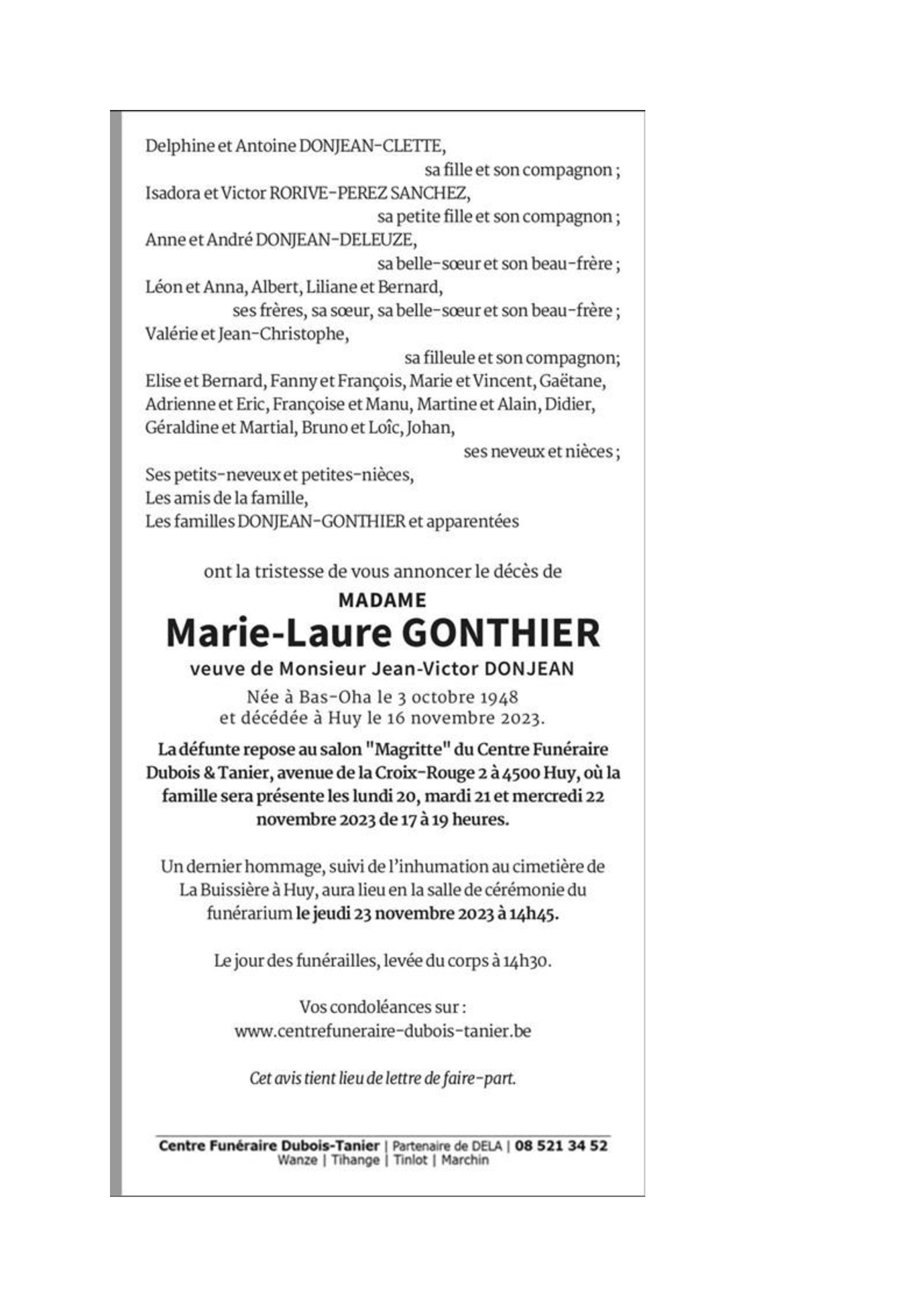 Née à Bas-Oha (4520) le dimanche 3 octobre 1948