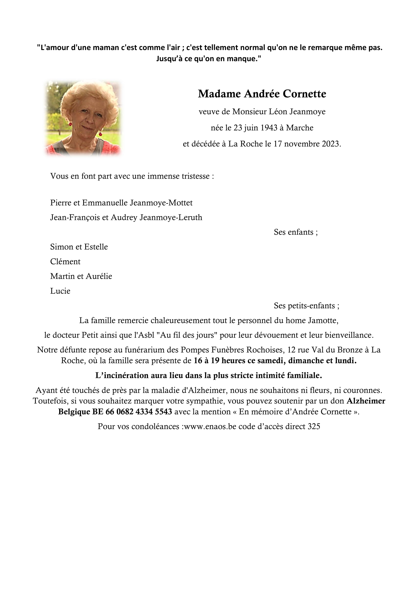 Died in La Roche-en-Ardenne (6980) on 17 November 2023 at the age of 80 years