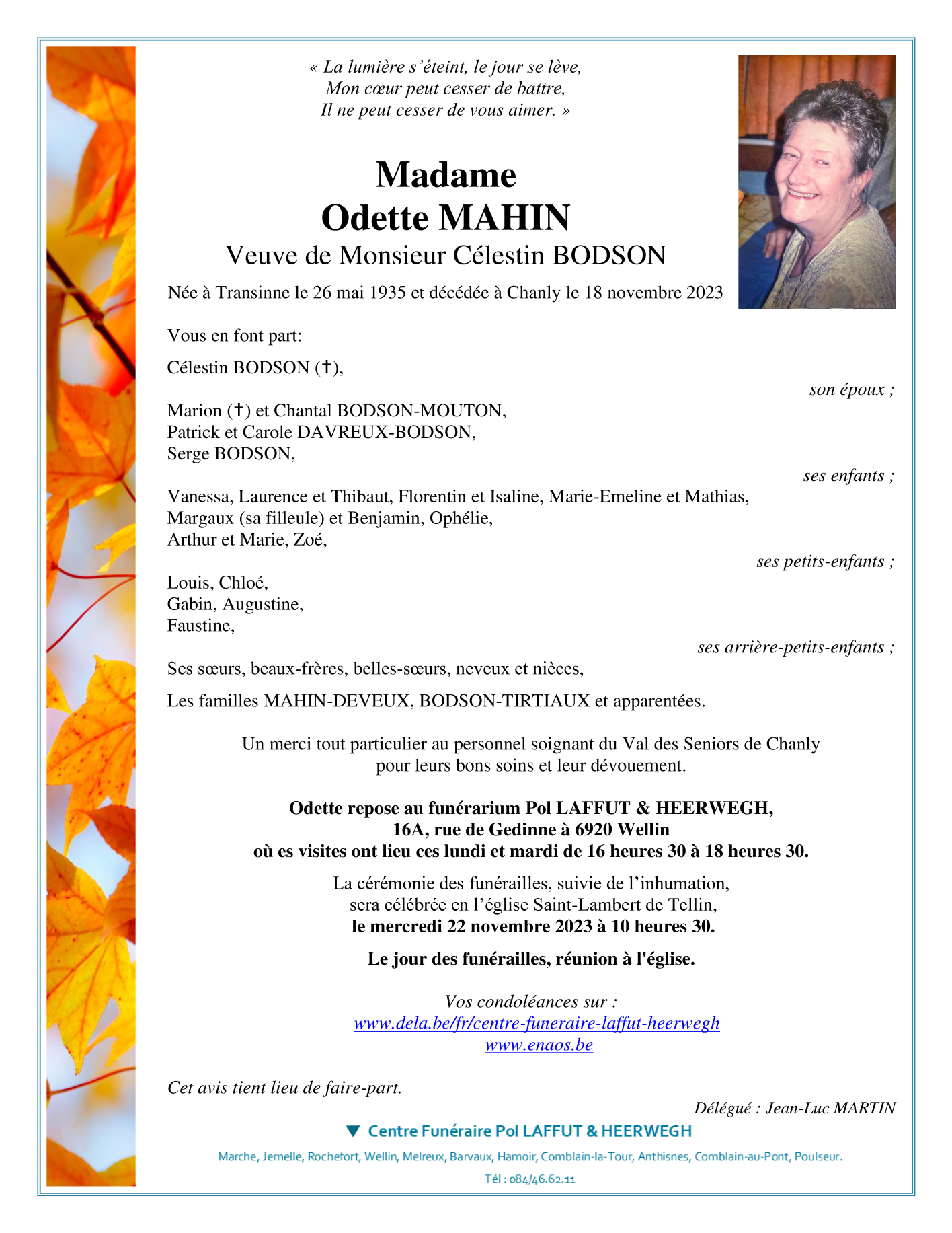 Fallecida en Chanly (6921) el sábado, 18 de noviembre de 2023 a la edad de 88 años