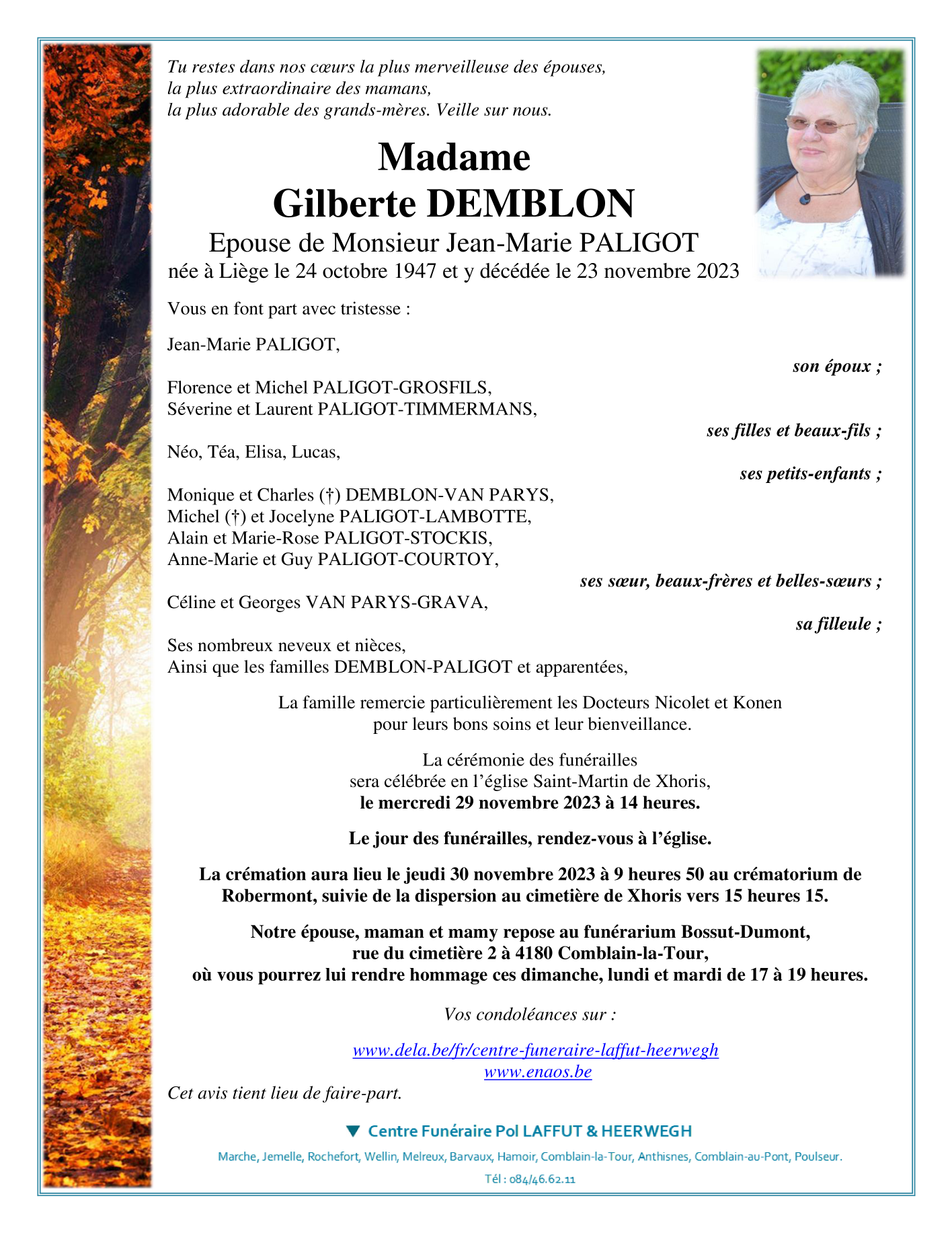 Décédée à Liège (4000) le jeudi 23 novembre 2023 à l'âge de 76 ans