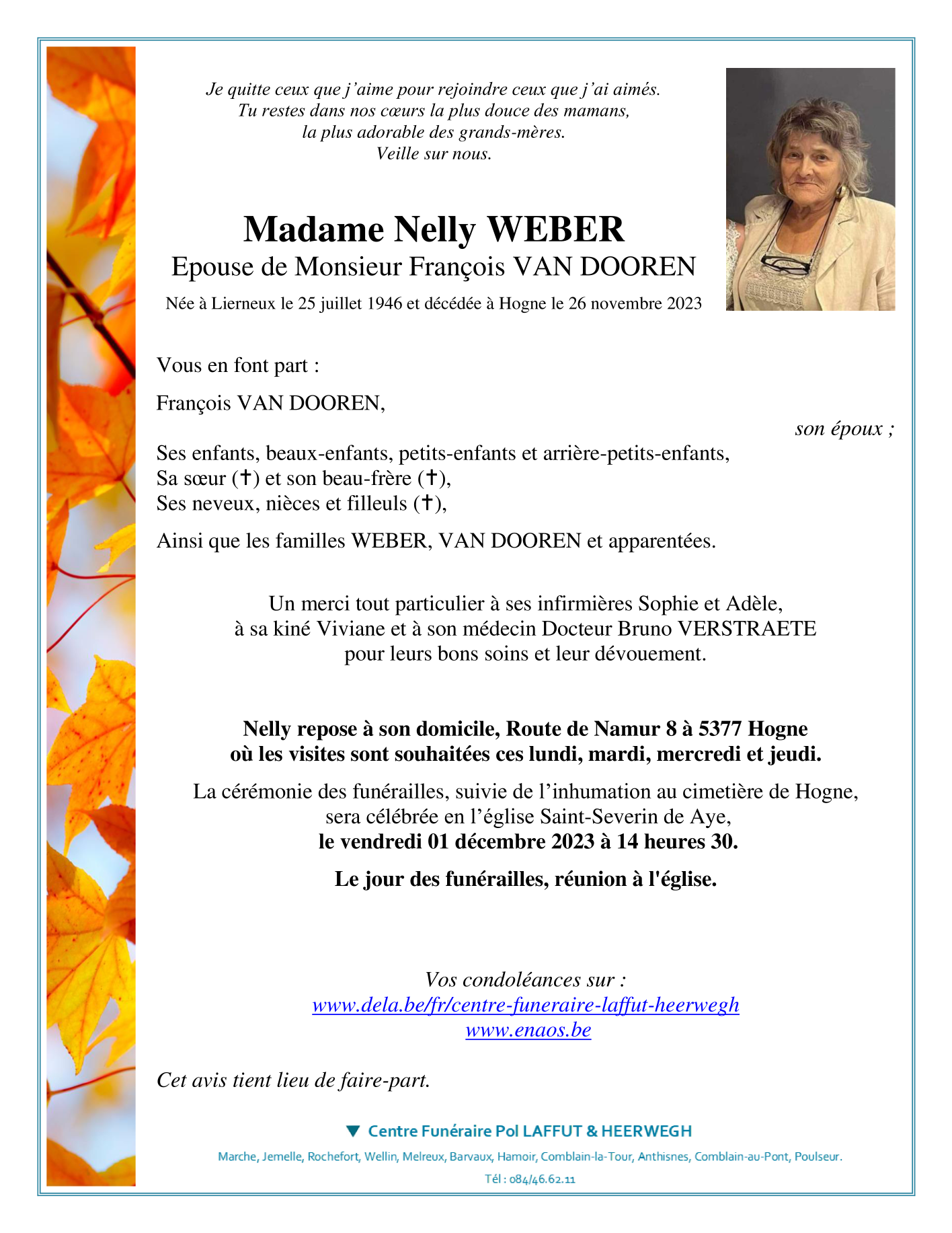 Décédée à Hogne (5377) le dimanche 26 novembre 2023 à l'âge de 77 ans