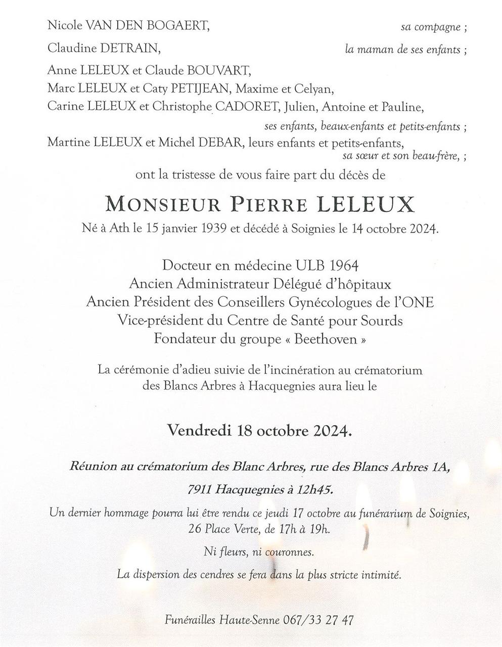 Décédé à Soignies (7060) le lundi 14 octobre 2024 à l'âge de 85 ans