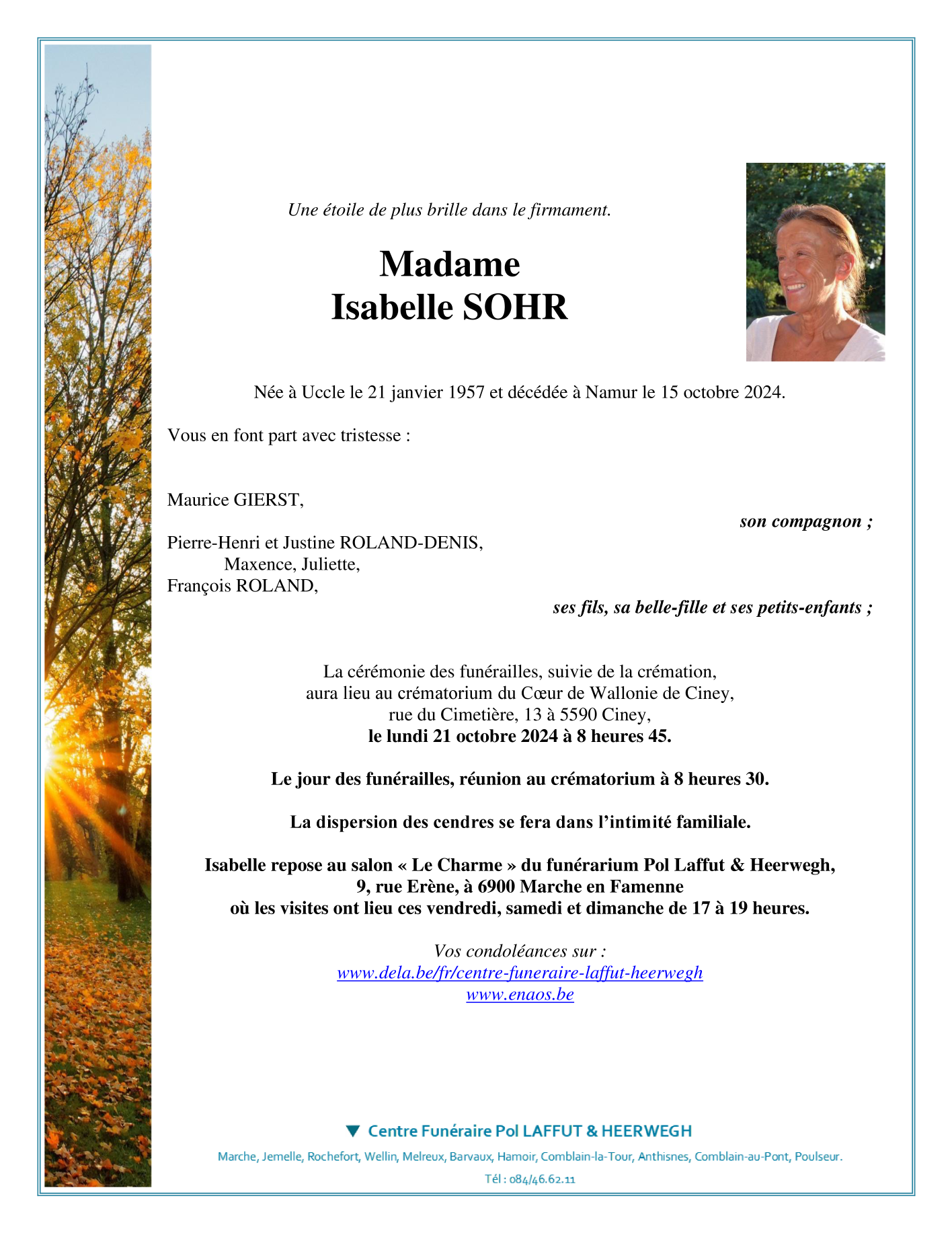 Décédée à Namur (5000) le mardi 15 octobre 2024 à l'âge de 67 ans