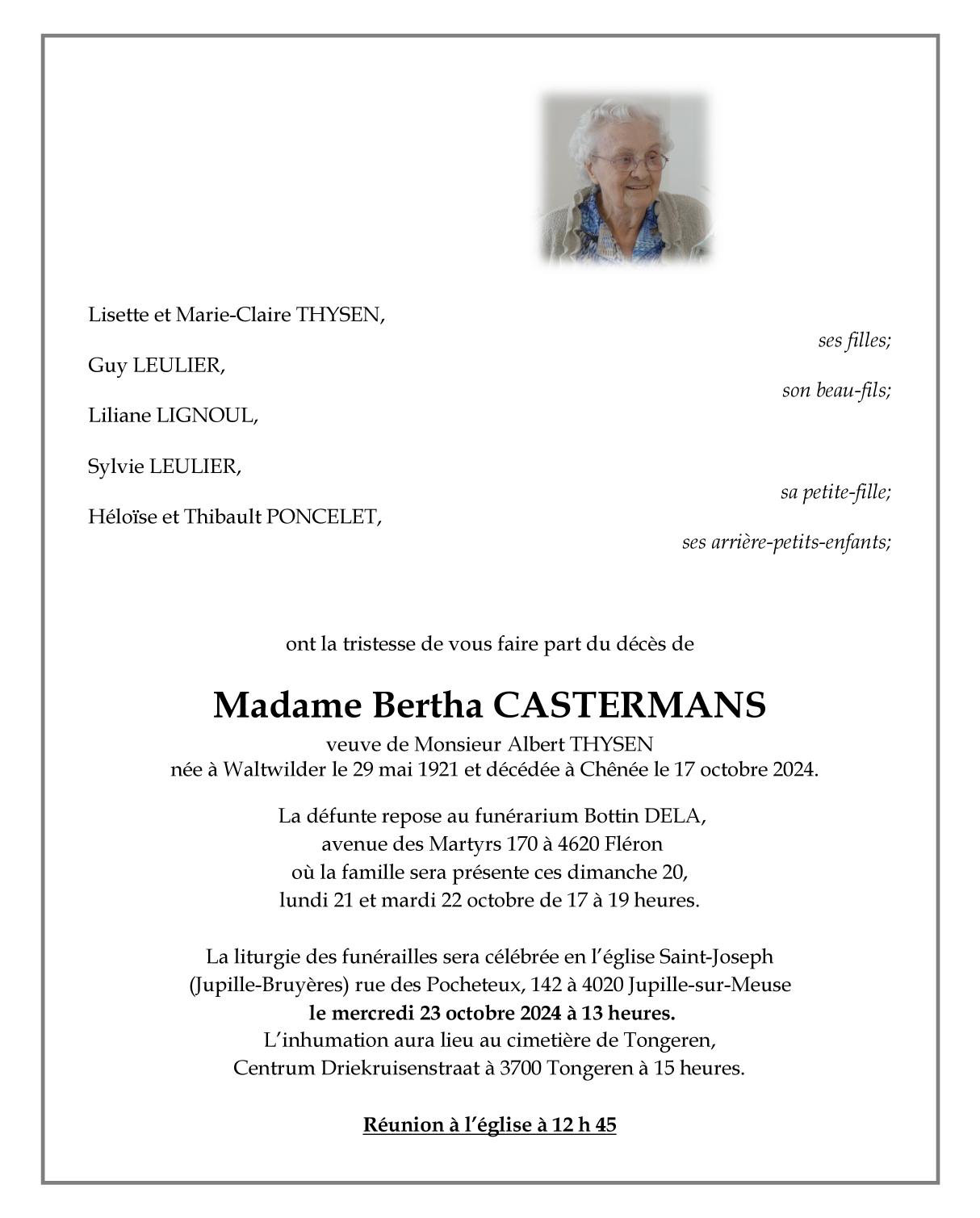 Décédée à Chênée (4032) le jeudi 17 octobre 2024 à l'âge de 103 ans
