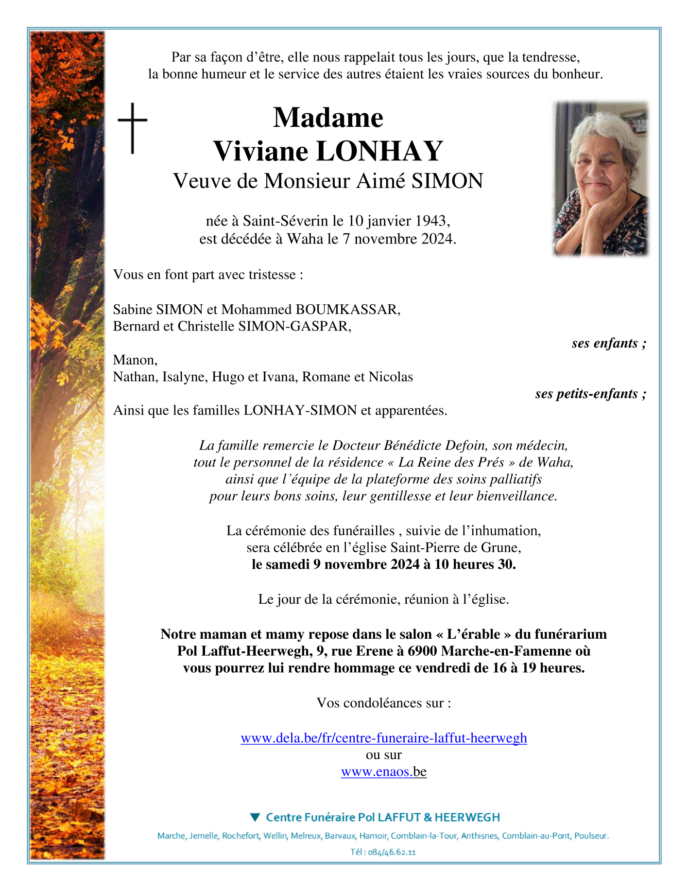 Décédée à Waha (6900) le jeudi 7 novembre 2024 à l'âge de 81 ans