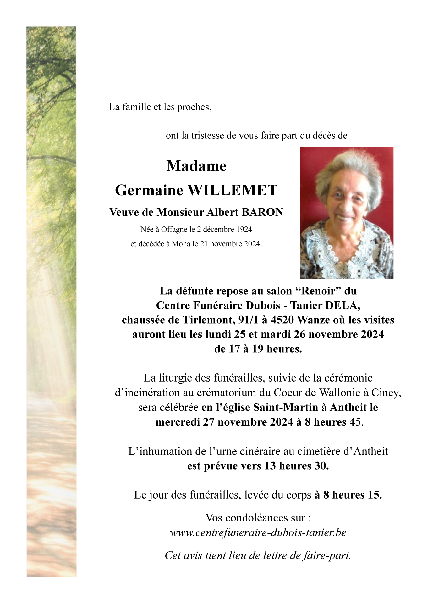 Décédée à Moha (4520) le jeudi 21 novembre 2024 à l'âge de 99 ans
