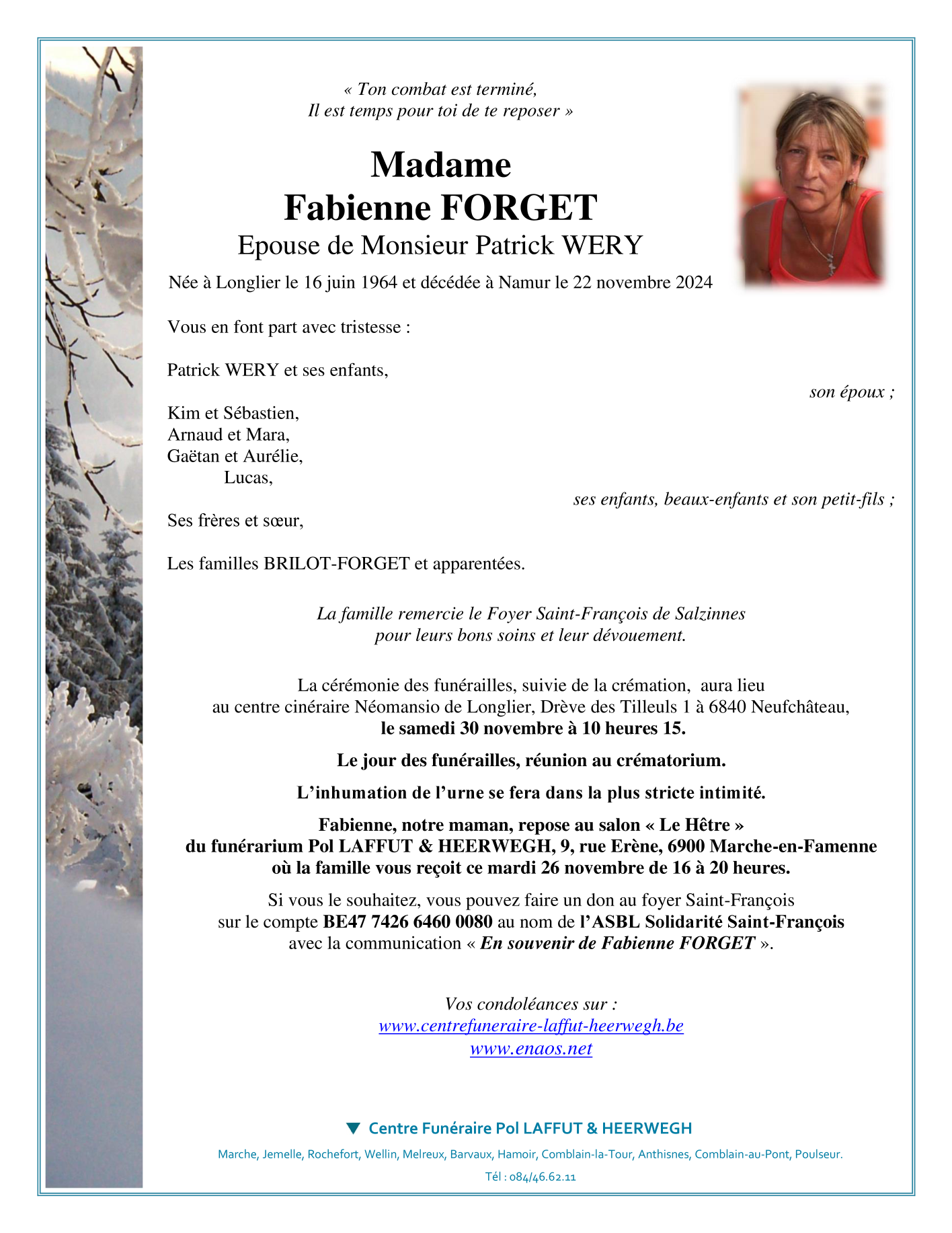 Décédée à Namur (5000) le samedi 23 novembre 2024 à l'âge de 60 ans