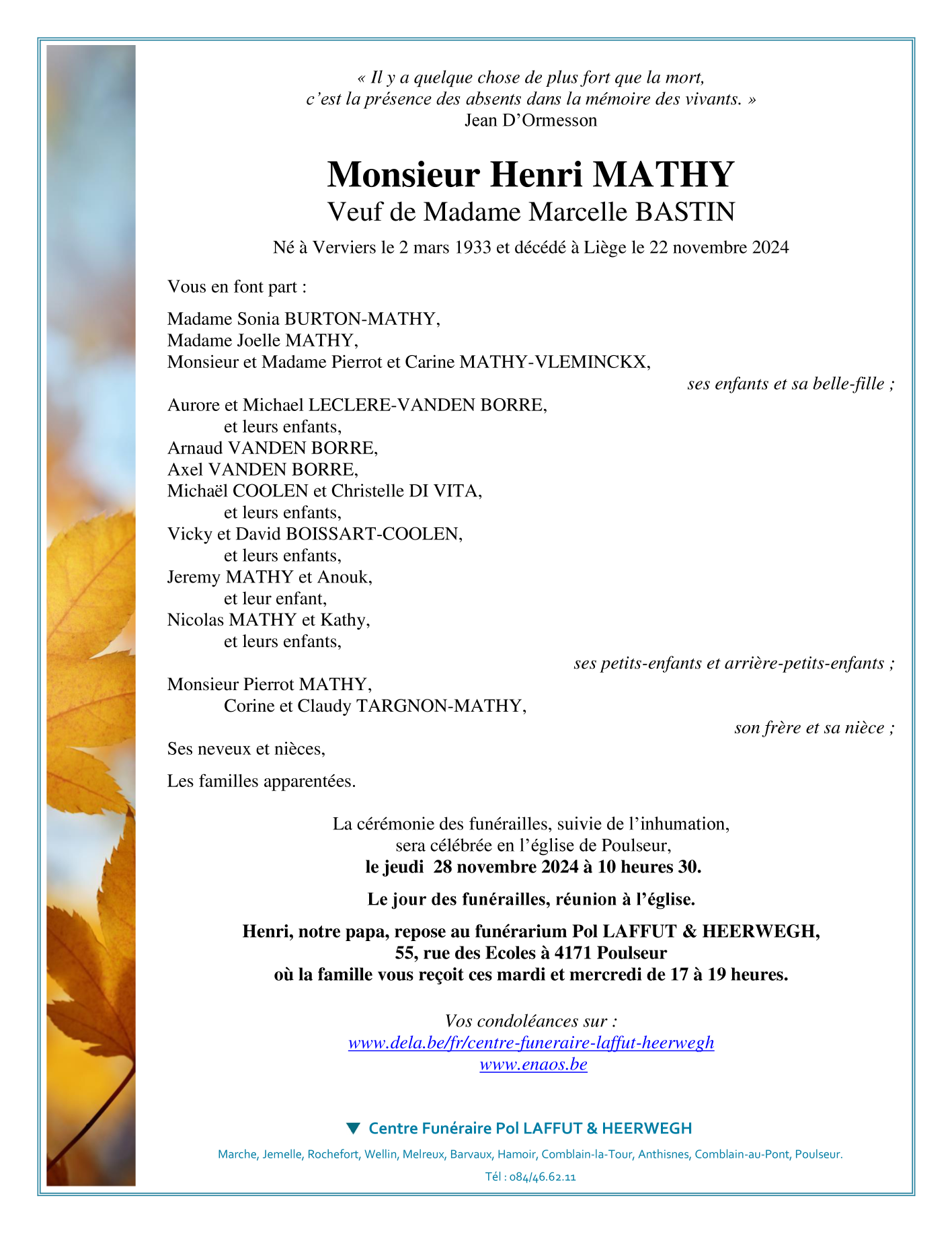 Décédé à Liège (4000) le vendredi 22 novembre 2024 à l'âge de 91 ans