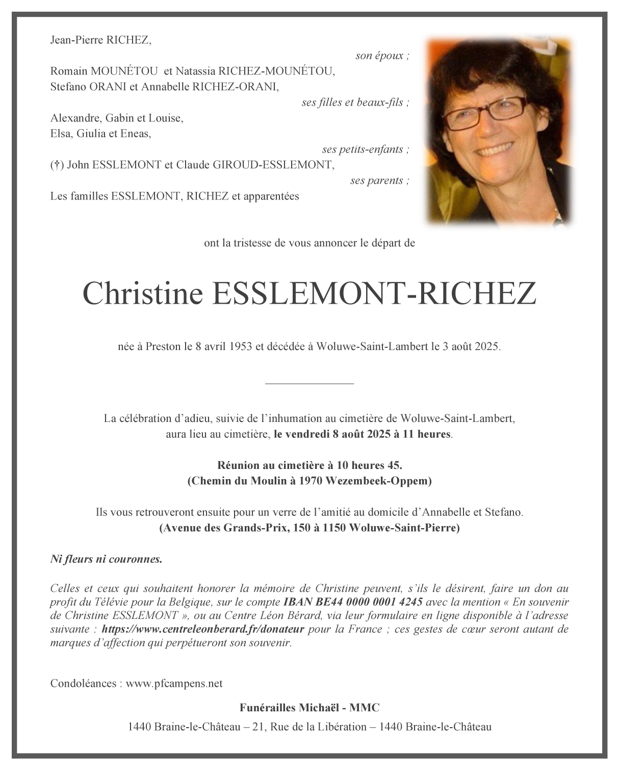 Décédée à Woluwe-Saint-Lambert (1200) le dimanche 3 août 2025 à l'âge de 72 ans