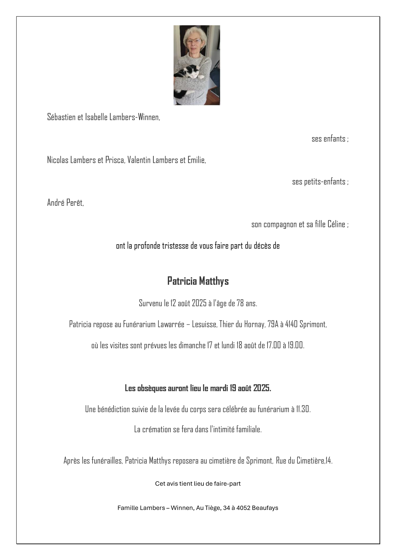 Décédée à Sprimont (4140) le mardi 12 août 2025 à l'âge de 78 ans
