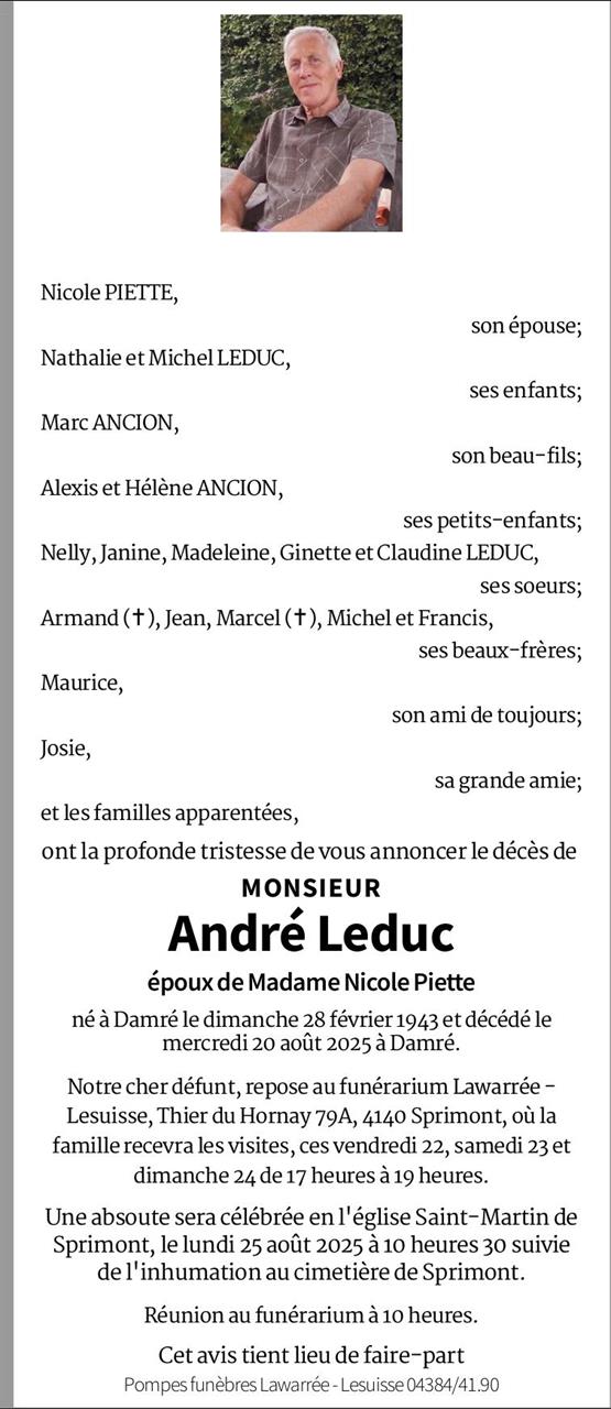 Décédé à Damré (4140) le mercredi 20 août 2025 à l'âge de 82 ans