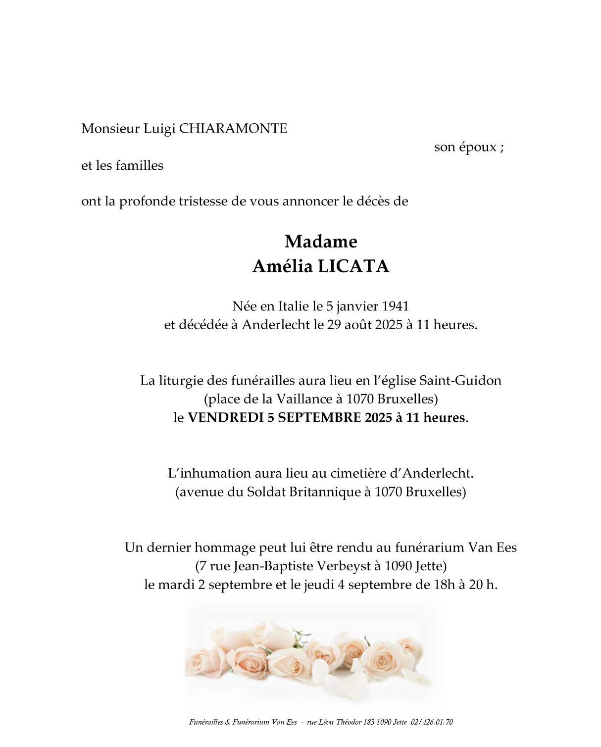 Décédée à Bruxelles (Anderlecht) (1070) le vendredi 29 août 2025 à l'âge de 84 ans