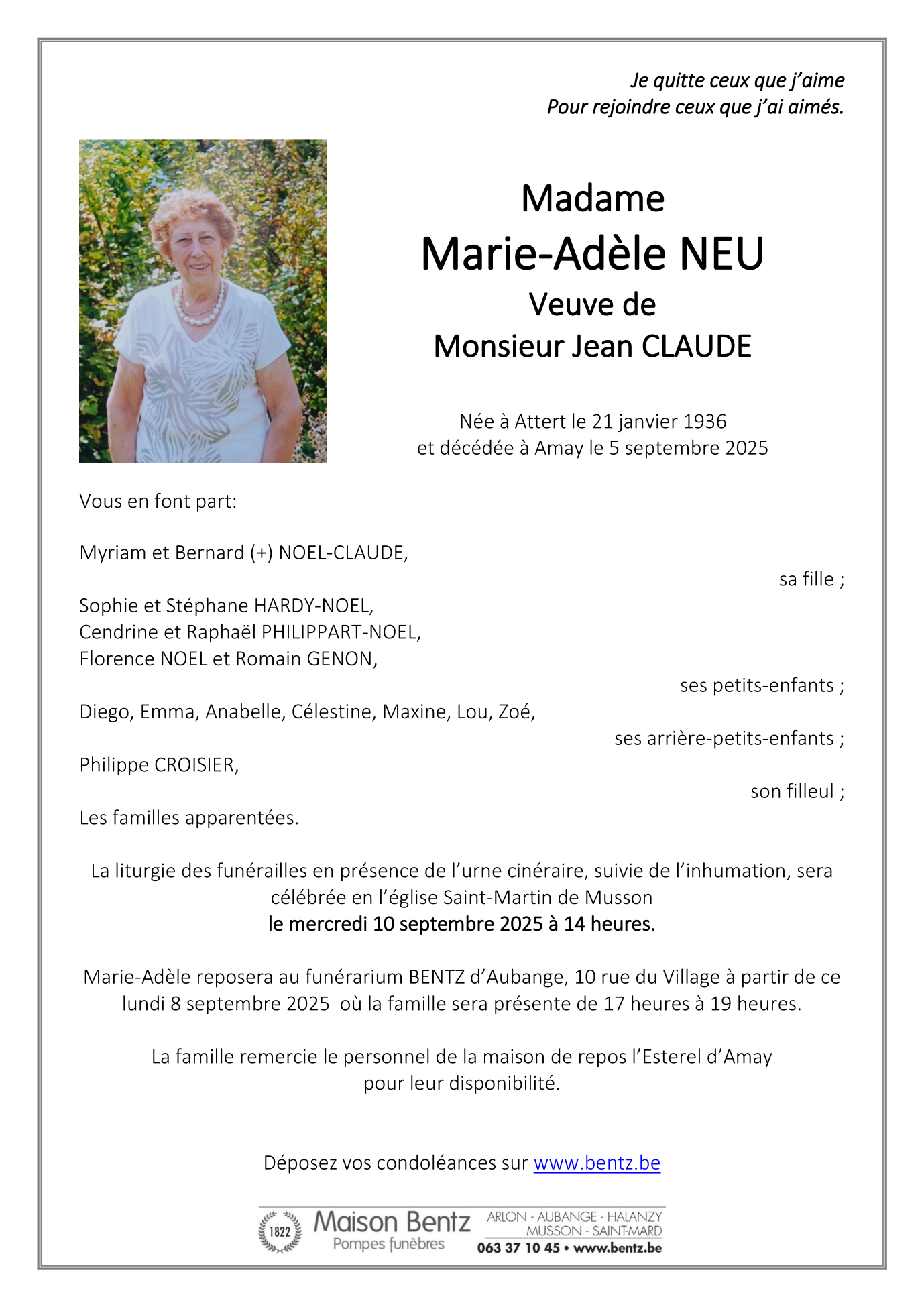 Décédée à Amay (4540) le vendredi 5 septembre 2025 à l'âge de 89 ans