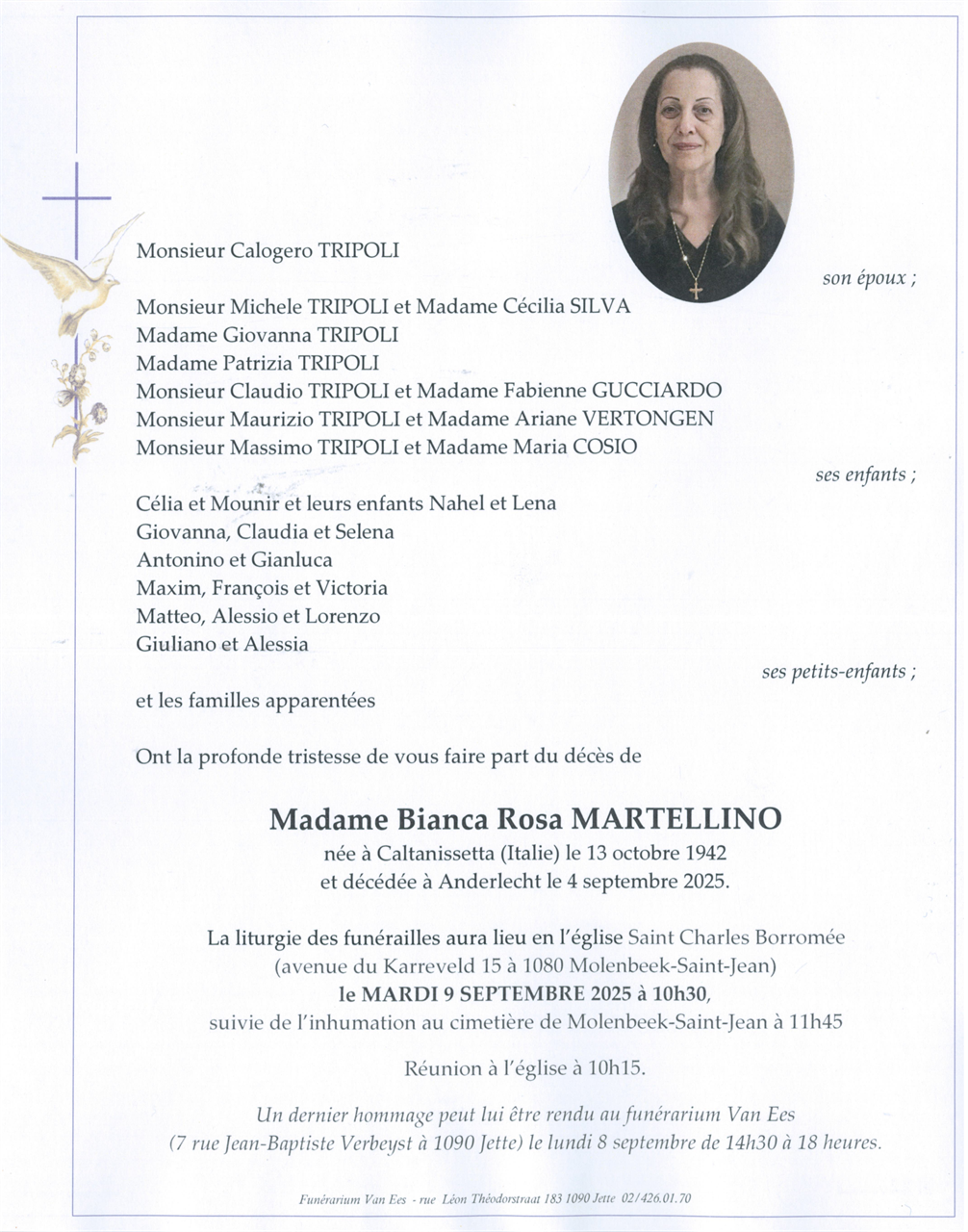 Décédée à Bruxelles (Anderlecht) (1070) le jeudi 4 septembre 2025 à l'âge de 82 ans