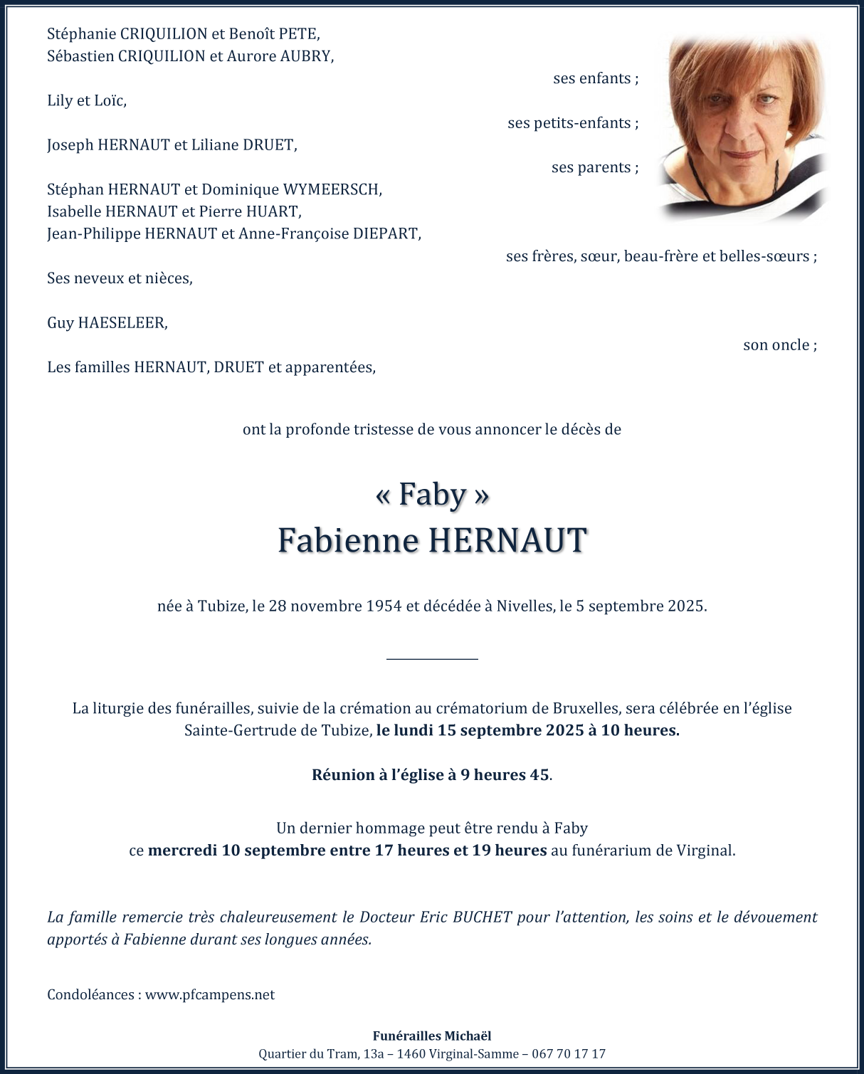 Overleden te Nivelles (1400) op vrijdag 5 september 2025 op 70-jarige leeftijd