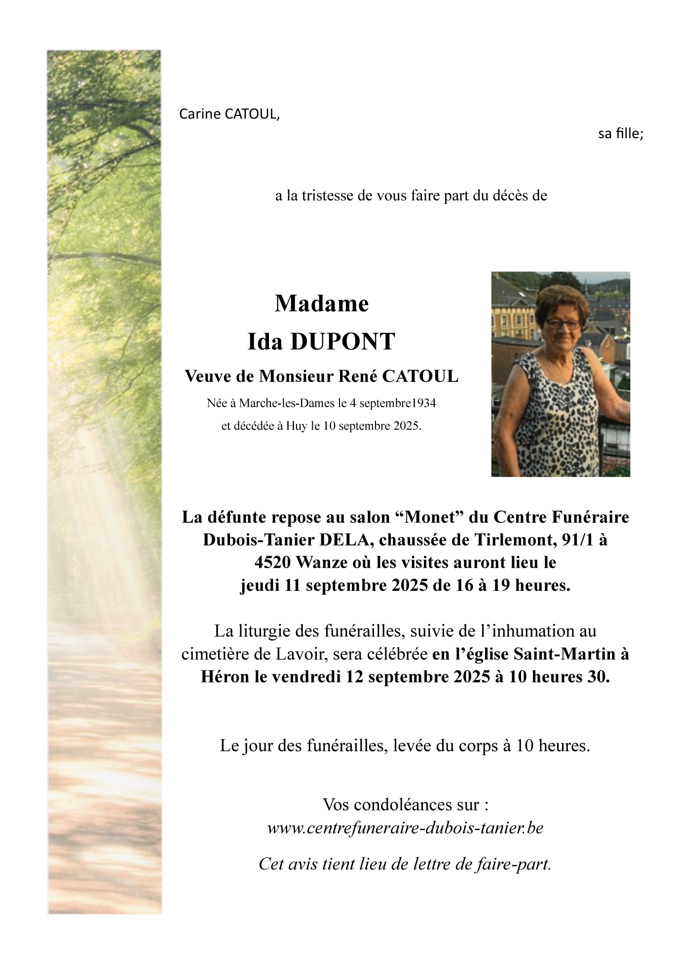 Décédée à Huy (4500) le mercredi 10 septembre 2025 à l'âge de 91 ans
