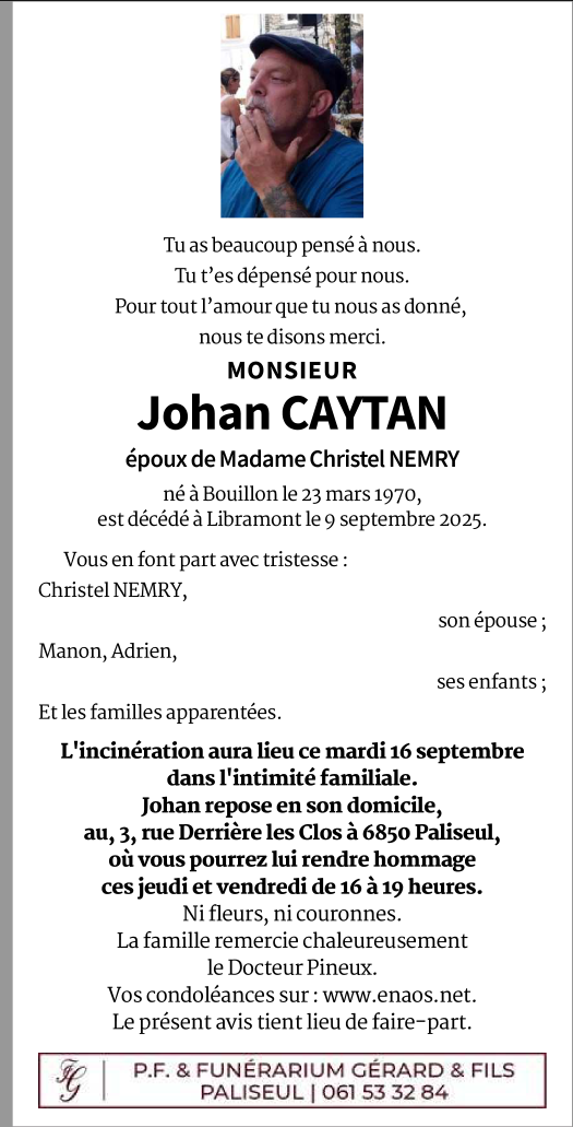 Décédé à Libramont (6800) le mercredi 10 septembre 2025 à l'âge de 55 ans