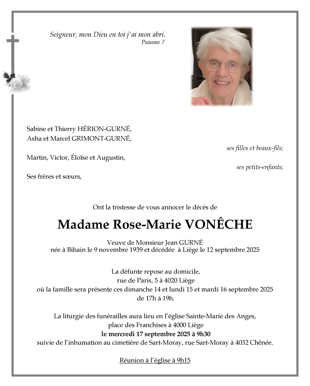 Décédée à Liège (4000) le vendredi 12 septembre 2025 à l'âge de 85 ans