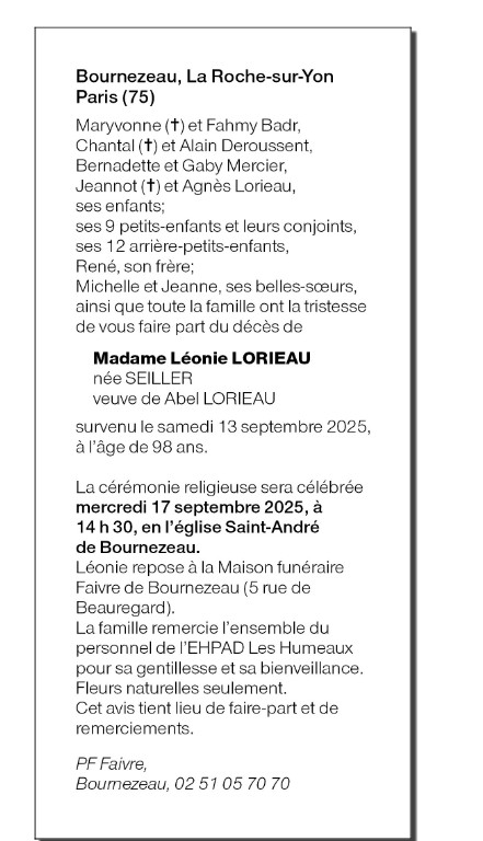 Fallecida en Bournezeau (85480, Francia) el sábado, 13 de septiembre de 2025 a la edad de 98 años