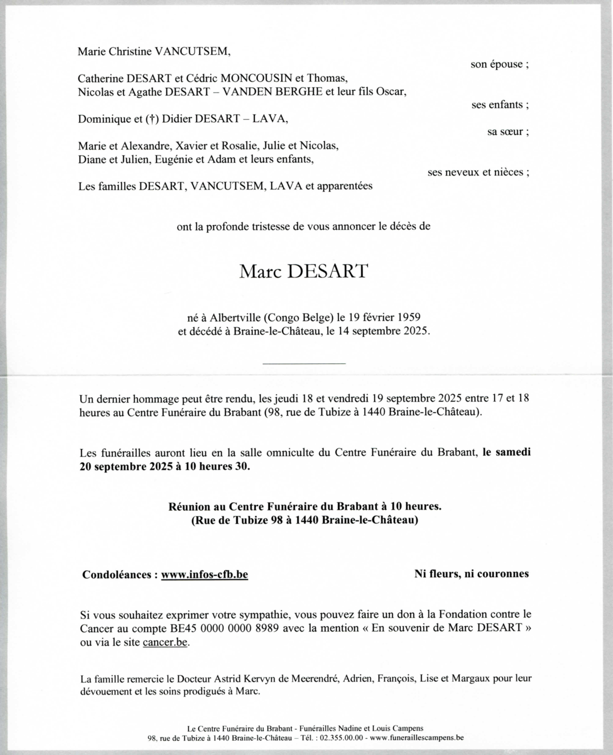 Overleden te Braine-le-Château (1440) op zondag 14 september 2025 op 66-jarige leeftijd