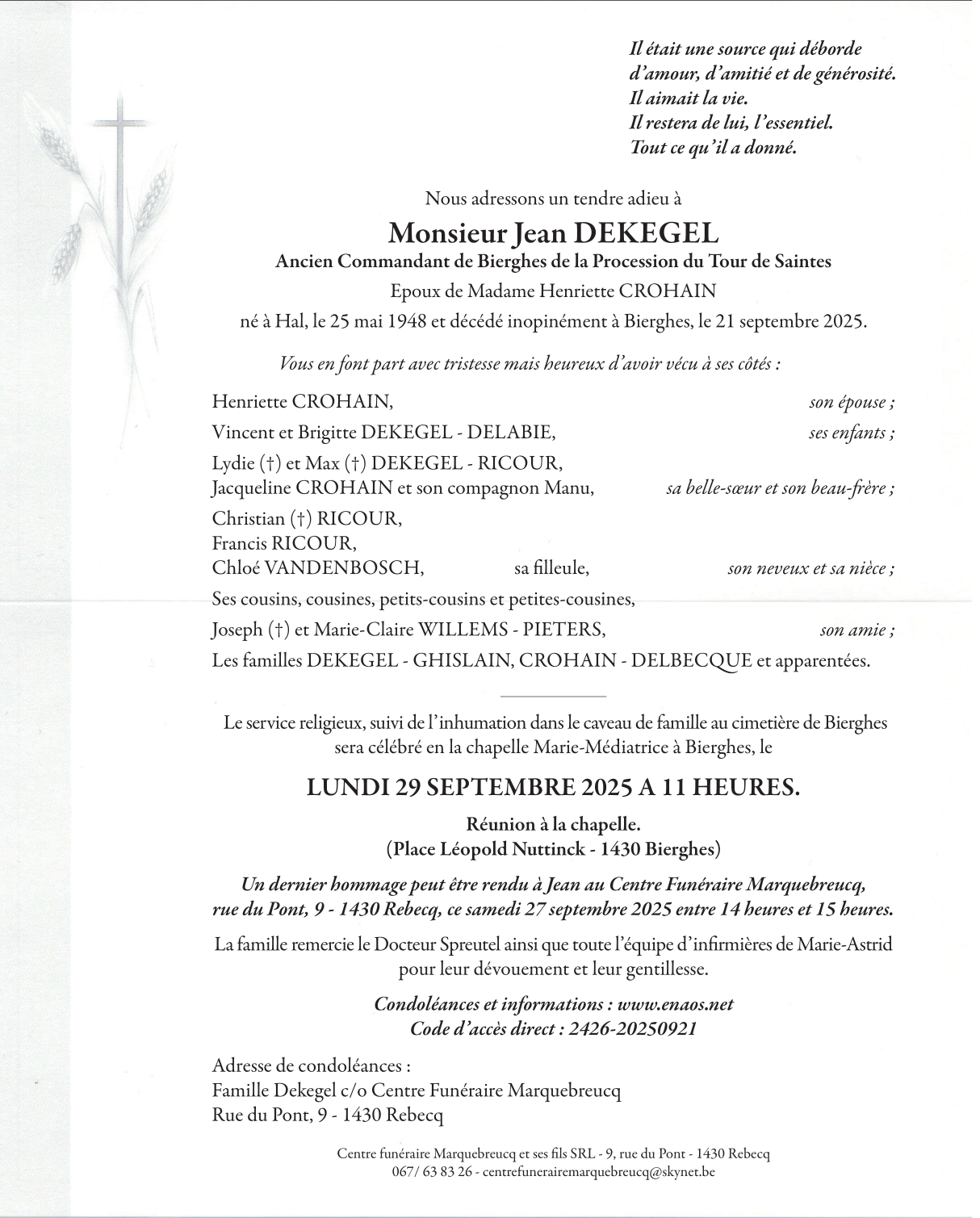 Fallecido en Bierghes (1430) el domingo, 21 de septiembre de 2025 a la edad de 77 años